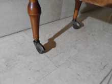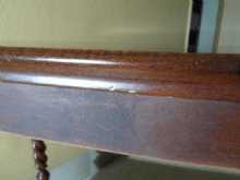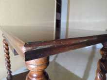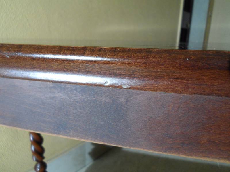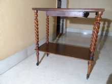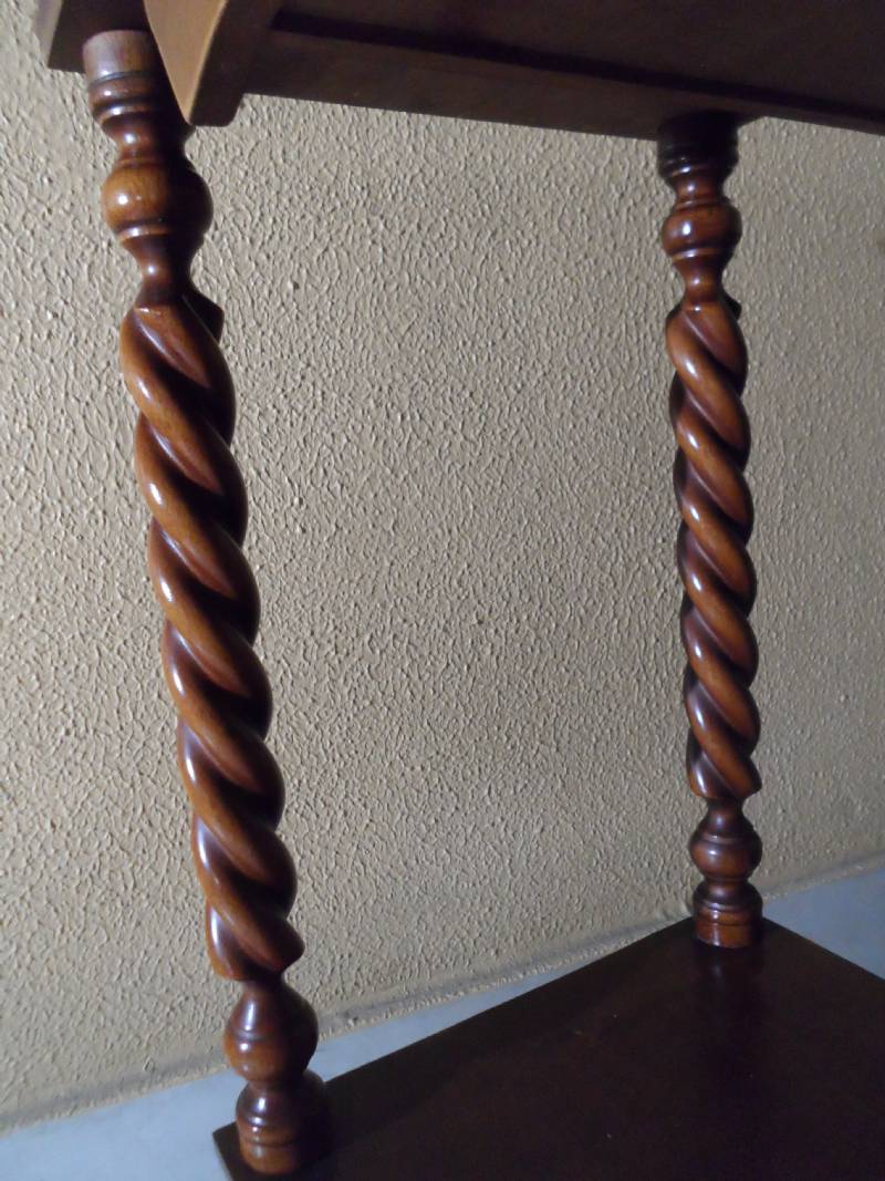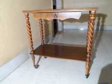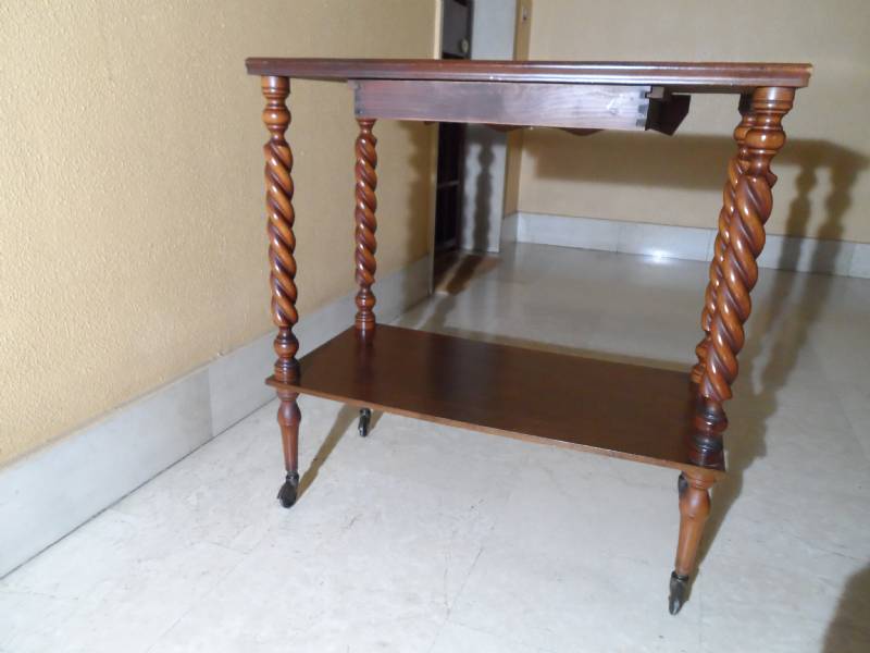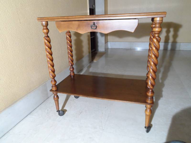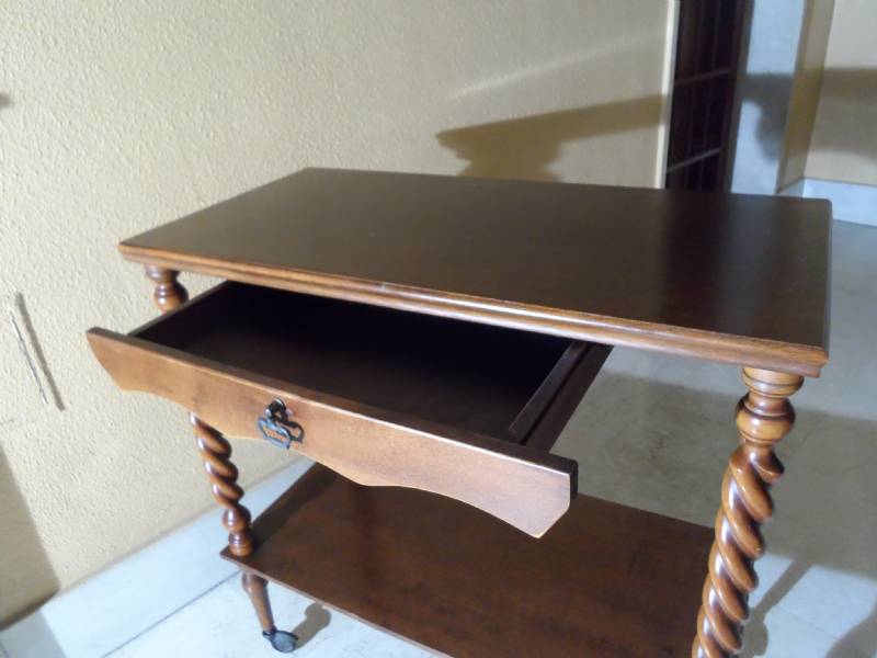 Elegante tavolino d’epoca realizzato in legno massello con stile classico, caratterizzato da gambe tornite a spirale, un pratico cassetto centrale e rotelle in ottone per una facile movimentazione