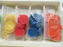 - 95 Gettoni "Azione" (20 mm) di plastica colorata: 16 x giallo, verde, rosso, blu e arancione, 15 nero