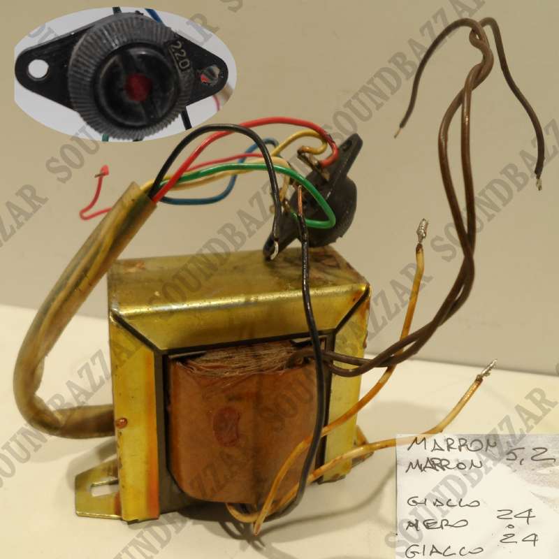 Imperdibile trasformatore con il primario che può funzionare, suppongo, a 110-125-160-220-240 V (NERO-ROSSO-GIALLO-BLU-BIANCO-VERDE) e doppio secondario (GIALLO-NERO-GIALLO) da 24-0-24V
