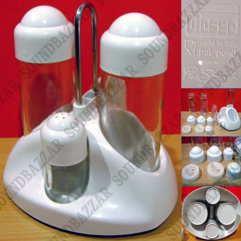 Stupendo set per condimenti (olio, aceto, sale e pepe) prodotto da BIESSE e creato dal grande designer italiano di utensili da cucina PINO SPAGNOLO negli anni '70
