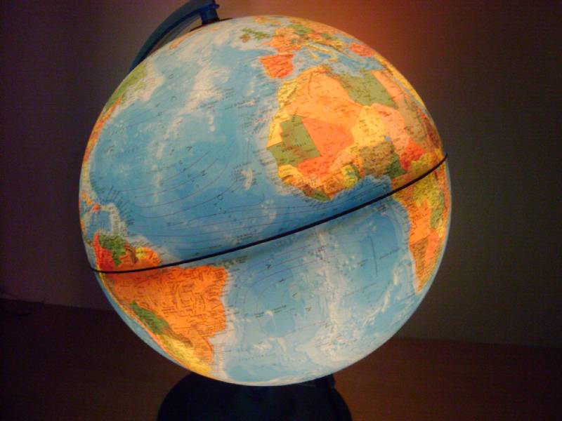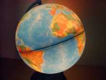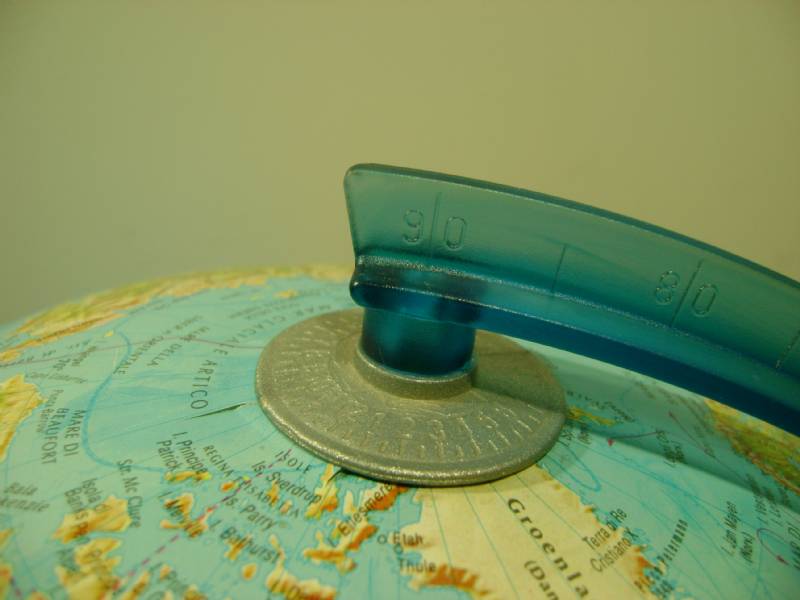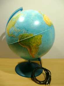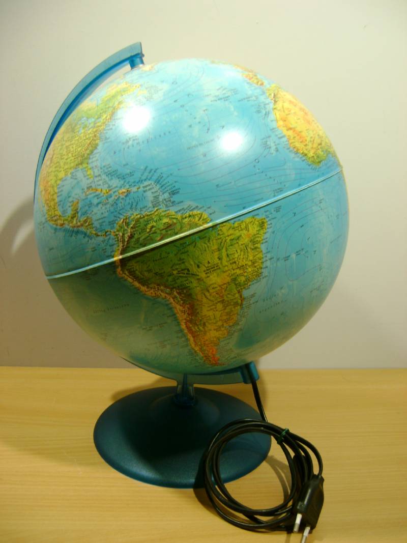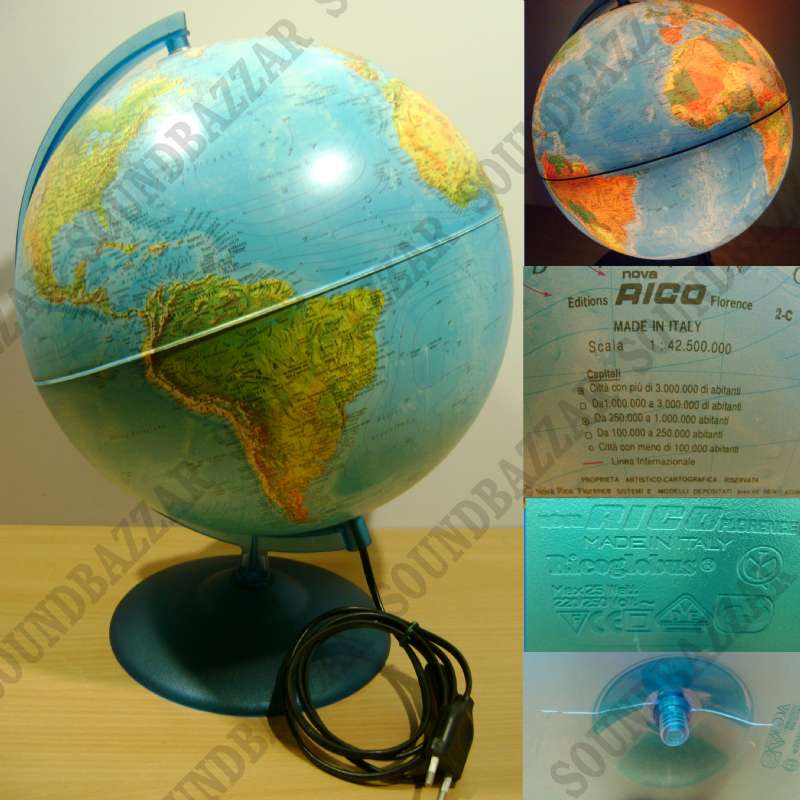 Si tratta di un mappamondo di 30 cm circa di diametro, realizzato in scala 1:42500000, completo di cavo con interrutore e luce all'interno che trasforma il mappamondo da fisico a politico