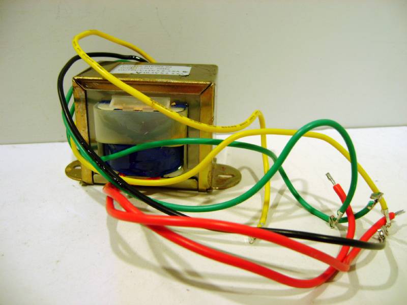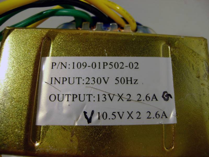 Pratico trasformatore con il primario che funziona a 230 V (ROSSO-ROSSO e doppio secondario (GIALLO-NERO-GIALLO) da 13-0-13V e 10,5-0-10,5V (VERDE-NERO-VERDE)